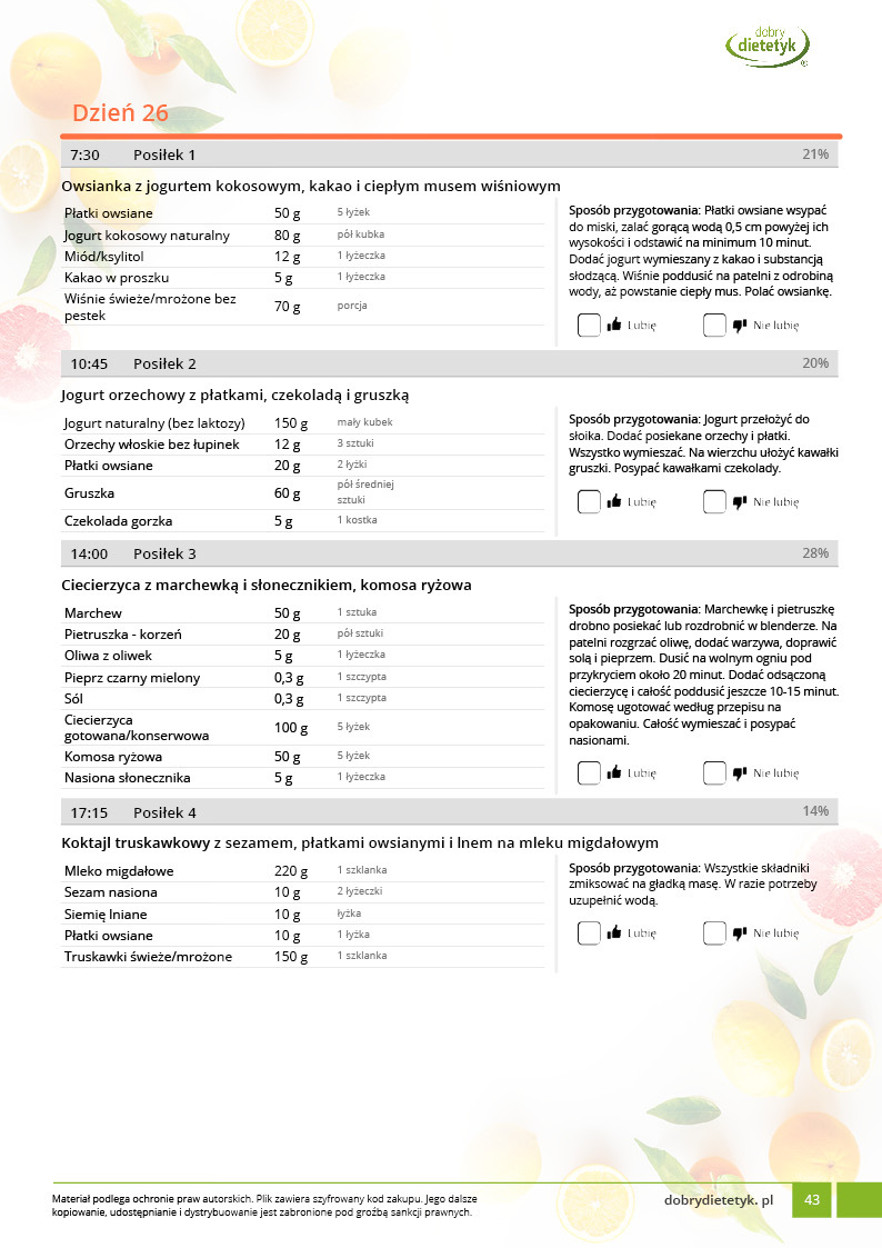 • w formie precyzyjnych jadłospisów wielodniowych (na każdy dzień miesiąca jest opracowany osobny jadłospis). Tutaj nie musisz zastanawiać się co zjeść każdego dnia, gdyż będziesz mieć dokładnie wszystko rozplanowane.