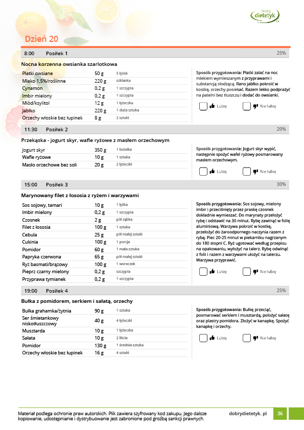 • w formie precyzyjnych jadłospisów wielodniowych (na każdy dzień miesiąca jest opracowany osobny jadłospis). Tutaj nie musisz zastanawiać się co zjeść każdego dnia, gdyż będziesz mieć dokładnie wszystko rozplanowane.