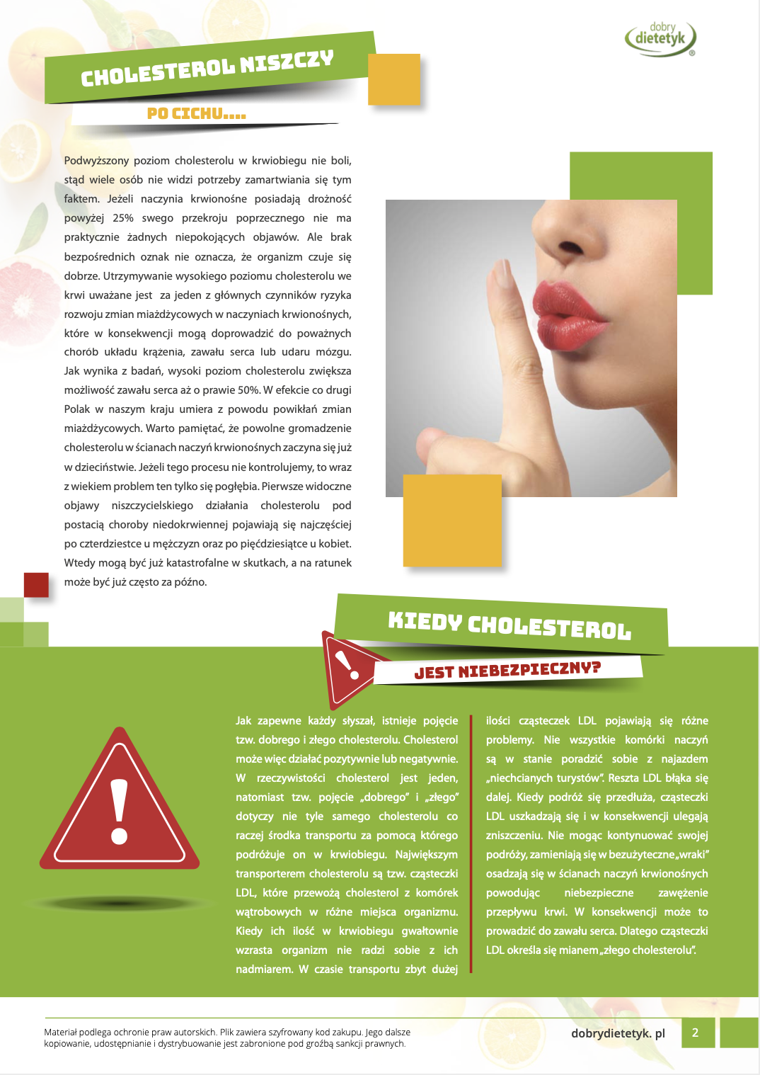 Kompleksowy 30-dniowy program żywieniowy dla kobiet, który w naturalny sposób pomaga obniżać poziom cholesterolu we krwi. Specjalnie opracowana dieta dodatkowo redukuje zbędne kilogramy, normalizuje poziom cukru we krwi, wspomaga serce oraz aktywuje przemianę materii. W jej składzie zadbano w szczególności o dostarczenie odpowiednich składników wpływających na proces prawidłowych przemian cholesterolu i tłuszczów w organizmie a także składniki chroniące przez rozwojem zmian miażdżycowych w naczyniach krwionośnych. W diecie zwrócono uwagę m.in. na zachowanie odpowiednich proporcji w dowozie kwasów tłuszczowych, poziom cholesterolu pokarmowego a także dostarczenie witamin antyoksydacyjnych. Dieta idealna dla kobiet zbliżających się lub wchodzących w okres przekwitania.
